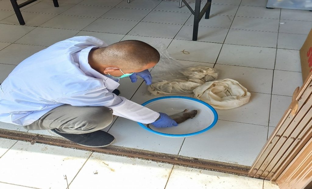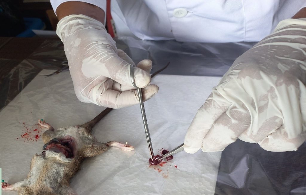 Mengambil ginjal kanan dan kiri, dalam 1 tube, kemudian satu ginjal dipotong menjadi 3 bagian selanjutnya dimasukkan dalam tube berisi alkohol 70%, tutup tube dilapisi parafilm, diberi label dan melakukan sterilisasi alat bedah setiap 1 ekor tikus.12 ginjal dikirim ke Labkesmas Banjarnegara untuk dilakukan pemeriksaan deteksi bakteri Leptospira menggunakan metode Polymerase Chain Reaction (PCR)