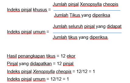 Analisis data kepadatan pinjal dihitung berdasarkan indeks pinjal khusus (IPK) dan indeks pinjal umum (IPU). pinjal khusus adalah jumlah pinjal Xenopsylla cheopis dibagi dengan jumlah tikus yang tertangkap dan diperiksa. Adapun indeks pinjal umum adalah jumlah pinjal umum (semua pinjal) dibagi dengan jumlah tikus yang tertangkap dan diperiksa.