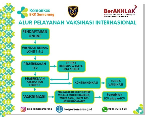 UPT Bidang Kekarantinaan Kementerian Kesehatan Republik Indonesia merupakan penyelenggara utama dalam rangka pengawasan dan kewaspadaan dini terhadap lalu lintas pelaku perjalanan dan risiko terkait penularan penyakit PHEIC; menjadikan Balai Kekarantinaan Kesehatan Kelas I Semarang sebagai UPT Bidang Kekarantinaan Kementerian Kesehatan Republik Indonesia turut menyelenggarakan pelayanan vaksinasi Internasional. Bukti seseorang telah menerima vaksinasi Internasional adalah berupa International Certivicate of Vaccination (ICV) baik dalam bentuk fisik/maupun elektronik yang juga dapat diterbitkan oleh Balai Kekarantinaan Kesehatan Kelas I Semarang.