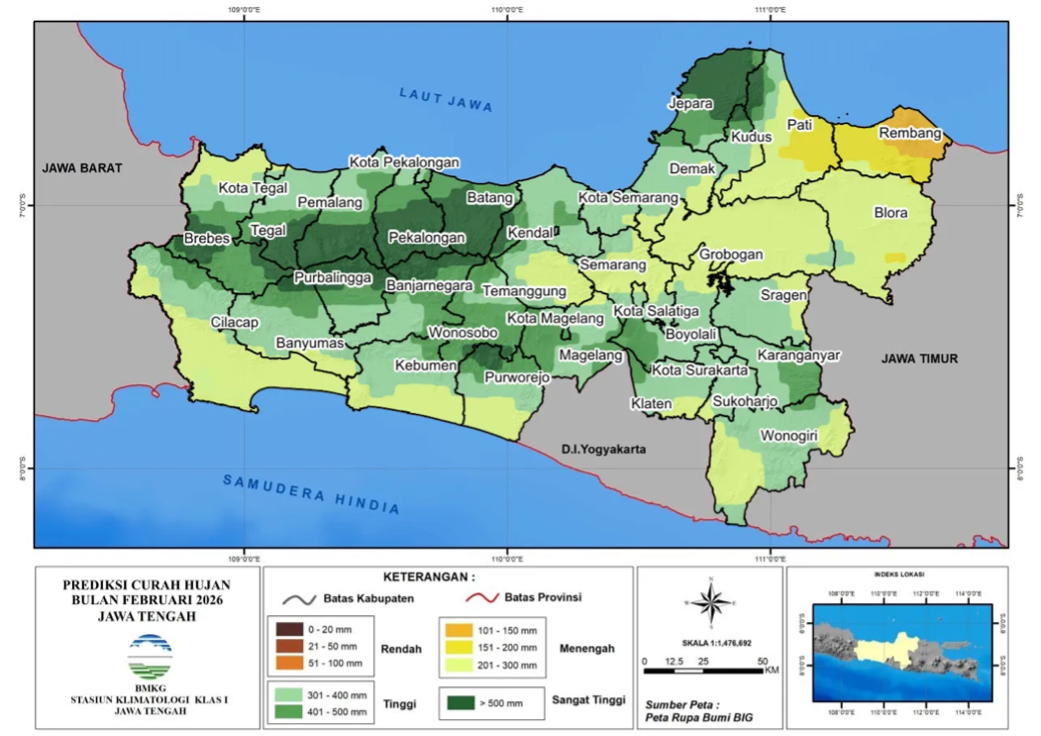 Prediksi Curah Hujan Bulan Februari 2026 di Wilayah Jawa Tengah (BMKG)